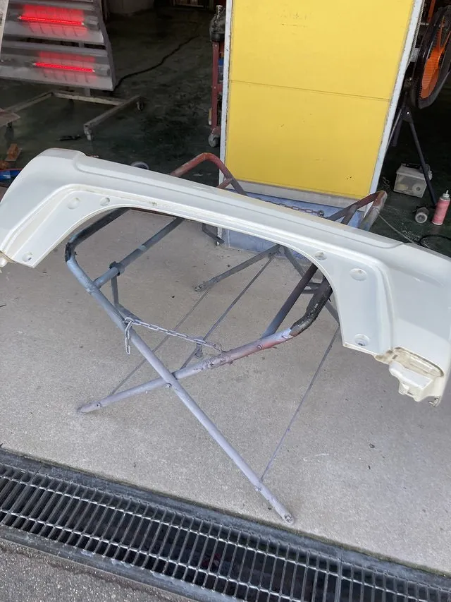 中古のバンパーですのでかなり汚れていましたので、専用の水アカ除去剤で鉄粉と共に落とします。汚れ除去後、傷を研磨し平らにしていきます。研磨後、下地にサフェイサーを塗布しボディー色を塗装します。