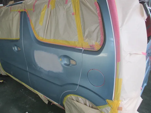 今回の修理は左リアドアの線キズでうすく凹みがあるので、凹みを修正し塗装という修理内容です。見積時に修理内容を説明し納得いただいて修理となりました。塗装範囲ですが隣接パネルと色の違いが出ないようフロントドアとリアフェンダーもぼかし塗装していきます。また仕上がりを重視するためにドアハンドルなどの部品も外して塗装します。
